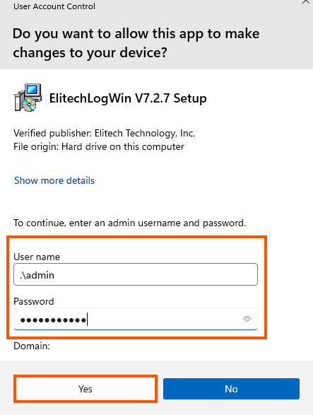 - ใส่ User, Password ของ Admin แล้วกด Yes
