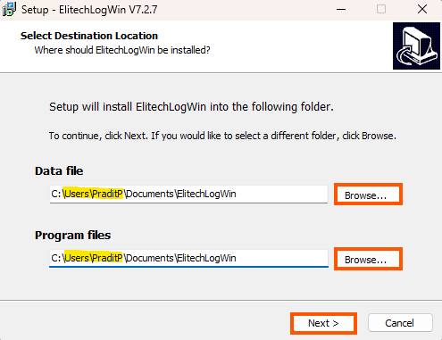 - วิธีแก้คือเปลี่ยน Default destination file install ให้ไปอยู่ใน account user ที่เป็นของ user ผู้ใช้งานโดยกด Browse.. ทั้ง 2 ให้ไปติดตั้งไว้ภายใต้ account user แทนดังนี้