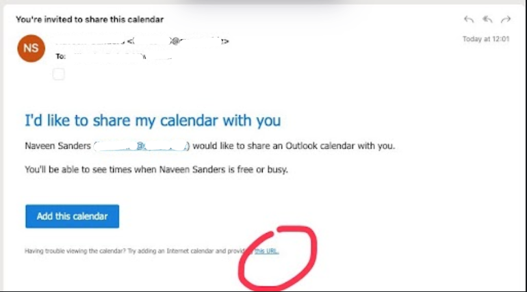 2. Copy the calendar URL from the email (Right click "This URL" > Copy URL).