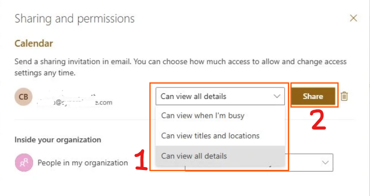 This will show how to share calendar from O365 to Gmail (Company account). Both side share via web interface.